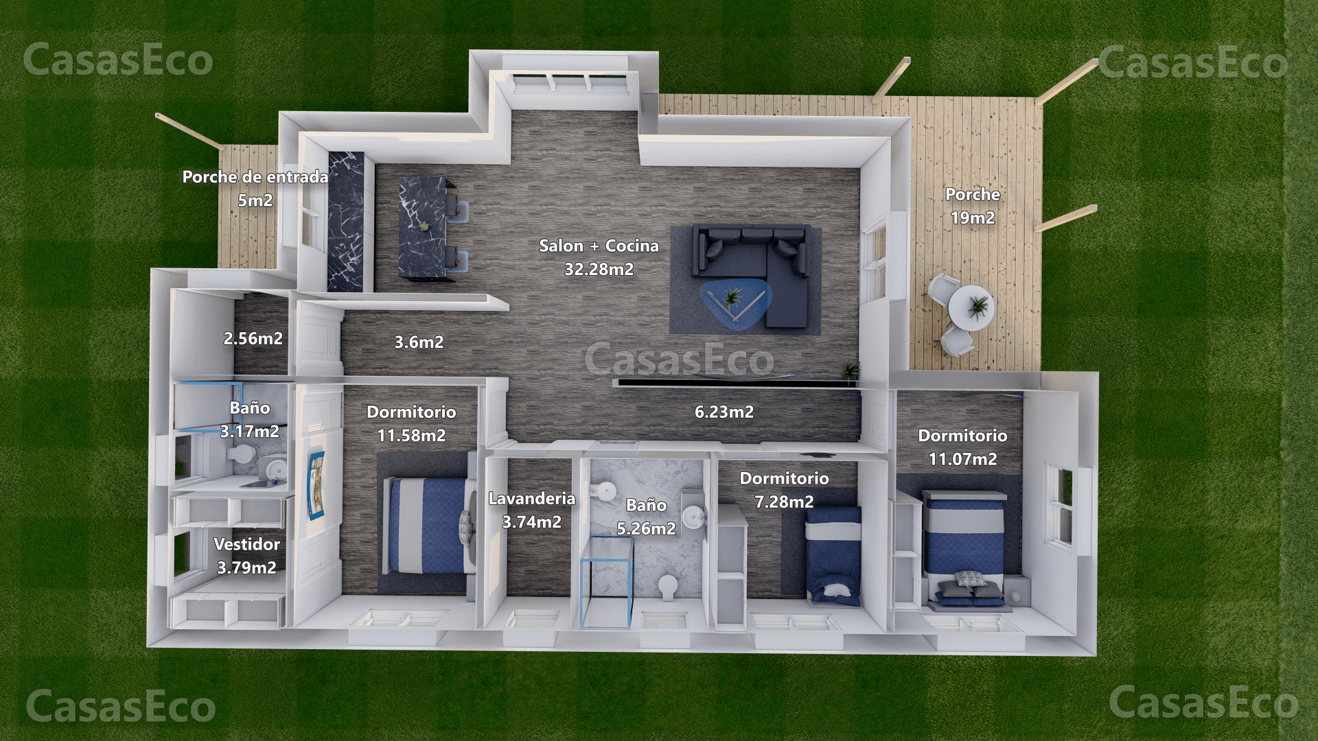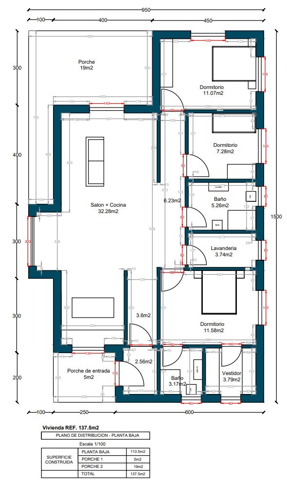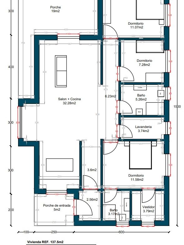 • Distribución: Salón, Cocina, 3 Dormitorios,1 Vestidor,2 Baños,1 Lavandería, 2 Porches,
